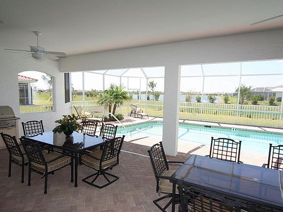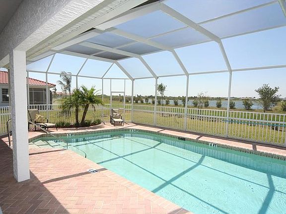 Maintenance free luxury Villa close to Clubhouse w/ Pool, built to the highest quality standards featuring: Barrel tile roof with foam insulation, insulated windows & sliders, paver driveway, courtyard entry with pergola, double car garage, large screened and tiled lanai with lake views. This is the smaller of two floorplans with 1509 sqft under AC with 3BR/2.5BA. a large floorplan with 1745 sqft also available. On the inside you will enjoy the entry area with a decorative arch, wood cabinetry in kitchen and both bathrooms, granite counters and bar in kitchen, pantry, stainless steel appliances, under mount sink, sun flooded great room with 18x18" tiles and 8 ft. glass sliders to the lanai, master bath with double Corian vanity, large Roman shower and privacy toilet, guest bath with double Corian vanity and Roman shower, powder room with designer washbowl, large laundry complete with front loading washer/dryer, Corian top and sink and custom cabinets, kitchen and lanai, 10 ft. ceilings in whole house, extra wide baseboards and crown moulding thru-out. All closets with custom wood shelving, Manabloc water system, 40 gallon waterheater, 2 car garage with window, pull down ladder with storage and garage openers. Just a few steps away there is the luxury clubhouse with indoor and outdoor entertaining, indoor kitchen and bar, large screened and covered lanai with summer kitchen, heated pool and restrooms. Great rental history! Built by Fiore Construction a certified "Green Builder".