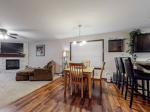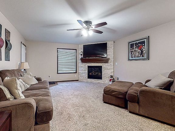 Main floor laundry, 3 bedroom, 2 bath, 6 ft privacy fence, white stone fireplace, front porch, walk-in closet, 2 stall detached garage, and unfinished basement.
