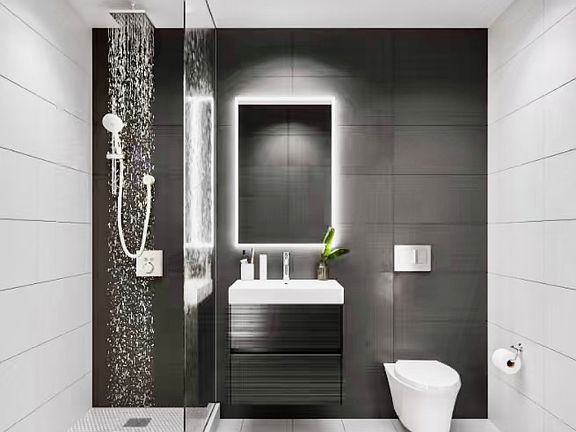 Modern bathroomHeated floorsRainfall shower headLarge windowsFog-free led mirror