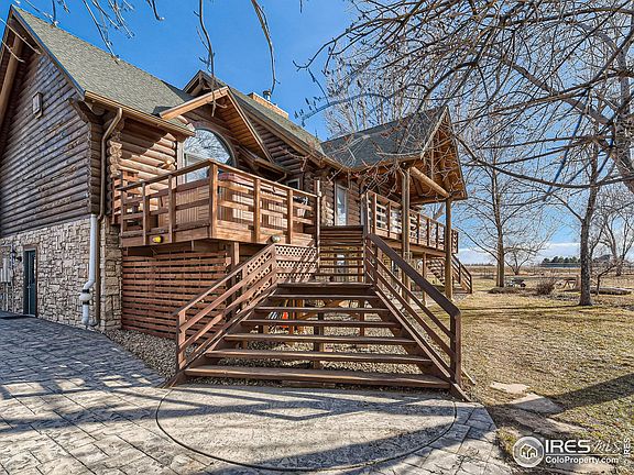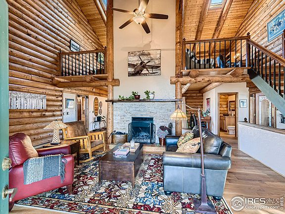 PRICE IMPROVEMENT! This spectacular 4 Bedroom, 3 Bath custom log home located in Parkland Estates is ready for you to call it yours! This iconic home is nestled on 2.1 private acres, has incredible mountain views and two expansive decks to enjoy the great outdoor living experience that Erie has to offer. This home is on a private airstrip with a hangar lot available to build your dream hangar. There is an option to add a taxiway for direct runway access as well as a possible additional hangar. The main entrance is off the west facing deck. When you enter the home, you are greeted by wire-brushed oak flooring, cathedral ceilings in the living room and a free standing fireplace. Skylights provide an abundance of light through the entire main level of the home and loft. The kitchen/family room area of the home has been completely remodeled including hickory cabinets, granite slab countertops, double oven, built-in microwave and cooktop. The spacious dining room, opening onto the east deck invites guests in with a charming gas heat stove. The primary ensuite bedroom is located on the main floor as well and boasts cathedral ceilings, an oversized walk-in steam shower, travertine counters and an abundance of closet space. Ready to entertain? The ground floor of the home is designed with 3 bedrooms, a wet bar and kitchenette, double patios and great room for gaming or relaxing. The laundry room is on this level with additional hobby space as well. Looking for workspace to spread out? The tandem, detached, oversized 3 car garage is designed with an insulated workshop and extensive storage area for toys and room to work. Additional outbuilding has a finished studio and two additional workshops. Property is zoned for horses and has a chicken coop/run. The location is perfect for commuting to Denver, Boulder, or Fort Collins. Weld County regulations and taxes apply.