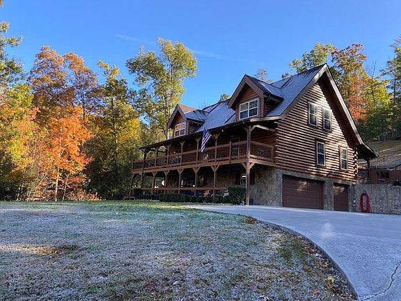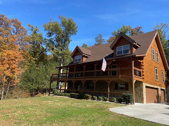 Stunning custom built log cabin on 5.4 acres is quality built throughout and shows in every detail. This roomy log cabin has 3 large bedrooms, 2 Full bathrooms and 2 Half baths. Super Tall ceilings in the Living room and Dining room show off the spectacular large beams and high windows. Kitchen is chef worthy with its high end appliances and granite counter tops. Master bedroom is located on the main level and has a large walk in closet and bathroom with shower and jetted tub. Upstairs has 2 more bedrooms a full bathroom and a large loft with a full size pool table. Basement level is finished and has a half bath and plenty of room to put a theater / game room or more sleeping area's. Home has a 3 car garage and even a whole home Generator. Plenty of porches to enjoy and relax on while taking in the views. Plus a built in grilling area with a beautiful stone work. If all that isn't enough the property also has a cute little crafting cabin with sidewalks that lead to the main house. This home is convenient to all attractions and will make a wonderful full time home, second home or vacation rental.