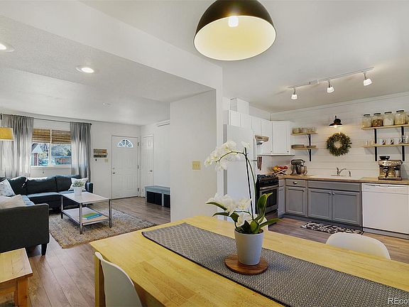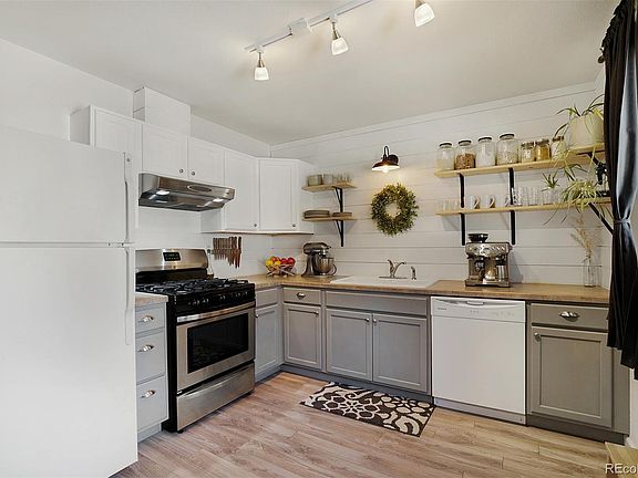 Great stucco ranch home on the west side, one block away from Palmer Land Trust open space. From the covered front porch to the remodeled interior, this is a tidy home with significant upgrades. The remodeled kitchen has two-tone painted cabinets with floating shelves, a large sink, two sets of lighting, a shiplap wall in the kitchen and even a ducted range hood. There is laminate wood flooring in all traffic areas and newer carpeting in the bedrooms. Sunny and bright throughout with all windows updated to vinyl-clad. The main level bath has a stackable washer and dryer (that stays with home) and fresh vanities, floating shelves and lighting. The living room has a big picture window looking out on the quiet street. The private backyard is level for lots of different applications, before it begins it's rise upward which enhances the privacy. The sunshade is included! The detached garage is oversized that allows for either a great storage space or a personal shop. Fun lighting, fresh and inviting, this is the easy day west side oasis you've longed for.