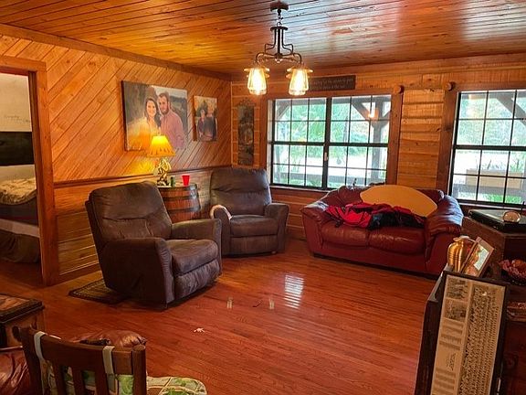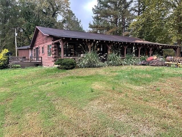 47+- acres with very private setting, good timber, some open area and nice stocked pond, features rustic home ,three bedrooms, kitchen, dinette, dining room, recreation room with kitchenette, hobby room, spacious master bedroom, large master bath with tub and shower., has 2 central heating and air units and covered front porch This property has good road frontage, walking trails and an abundance of wildlife( deer, turkey and small game) detached shop building with equipment shed and storage area.