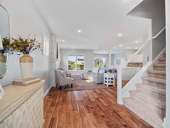 Located in Southwest Allen County, this villa is unique for the area because it is three bedrooms and three full bathrooms. Once you step inside the newly painted home, you are greeted with a bedroom or den and a full bath to your right. Step inside to the large family room, and you have a gorgeous view of the pond behind you and a gas fireplace turned on by the flip of a switch. The floor-to-ceiling fireplace is the centerpiece of the room. The kitchen is bright and inviting, with plenty of counter, space, and cabinets. If you need more, you also have a large walk-in pantry. All of the closets of this villa have built-ins. The primary bedroom has water views and a large bathroom with natural light and a walk-in shower, and a walk-in closet with built ins and a deadbolt for valuables. Head upstairs to another large multipurpose room, full bath, and another bedroom with bonus wall-to-wall storage. This home has a WiFi ready thermostat and garage door and ample storage in the garage space. The backyard features a poured concrete for dining and a spa/hot tub hookup. HOA covers lawn care including irrigation & snow removal from your driveway to the front door.