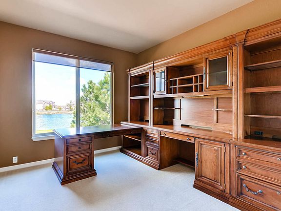 Backs to golf course and Elk Lake. Stunning home with huge windows in great room and master to enjoy incredible views. Stone exterior in front, extensive landscaping, paved walkways, 2 patio, mature evergreens. Wood floors entry, hallways, kitchen, nook. Large Kitchen has island, pantry, desk area, eating nook. Formal dining w/crown molding, living room and office w/french doors. Fireplace with custom stone. Hunter Douglas blinds, laundry sink. 5 pc master bath has tile floors. Garden level bsmt w/view. New water heater. Dual furnaces for evenly distributed heat. 2 rec centers, indoor Olympic size pool run by YMCA and outdoor pool, both have exercise facilities. 20 minutes to I-25. Serene setting, great price per SF.