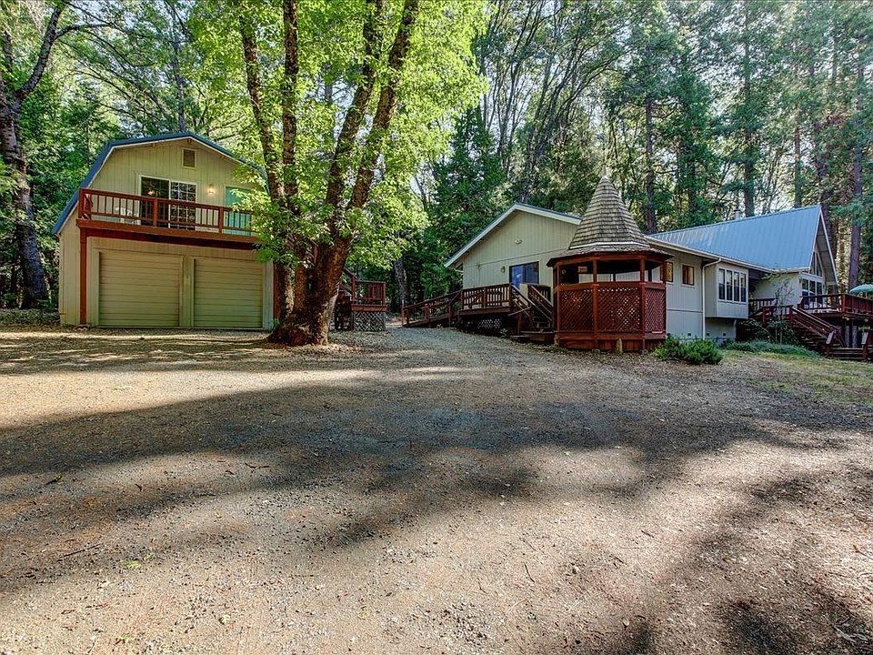 New price - updating needed. Trustees ready to sell! Craftsman style home built custom in 1989, with much attention to detail. This one owner home has unique features not found in other comparable homes in this price range. The high ceilings, custom pull out cabinet drawers, Vintage fireplace, spiral stair case and custom tile patterns in kitchen and bath. The main residence is 2437 sq. ft, 2 or 3 beds, 2 baths, with loft and laundry and wrapped decks on a 1.5 acre wooded lot. The bonus of this property is a 2304 sq. ft detached outbuilding in two levels. Originally built to restore planes and live in while building the main residence. Top story was used as a rental and a guest quarters with 2 bedrooms, full kitchen, 1 full bath of approx 1132 sq. ft. including a wood burning fireplace and private balcony entrance. The lower level of this offers a storage room, an office adjoining full bath and laundry hookups. Workbenches and additional lighting with room for 3 cars. Both buildings have metal roofs. There is a turret building off the master bedroom with a hand tiled spa. Located on banner mt. just minutes from Nevada City or Grass Valley. Clear septic report on file Internet is Comcast. Well report complete.