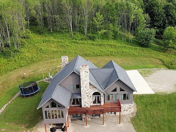 "Luxury Living In The Country" Check out this hard to find newer, high end home with breathtaking views and a quiet country setting. This home is loaded with great features, like a master suite with its own stone fireplace, walk in closet, & granite vanity top. There are also an additional three bedrooms with the possibility of more if needed, along with two and a half more bathrooms with high end finishes. The stone work inside and outside is truly a work of art that accents the cedar shake style vinyl siding. The large tigerwood deck out front overlook the surrounding hills. Both living room areas have hand picked stone surrounding the fireplaces. The kitchen is another stunning part of this home with a large marble island & quartz countertops that highlight the solid cherry cabinets. The kitchen flows to the one of a kind dining room surrounded by glass. The flooring varies throughout with high end ceramic tile, clear white oak hardwoods, and carpet. Too many features to list!