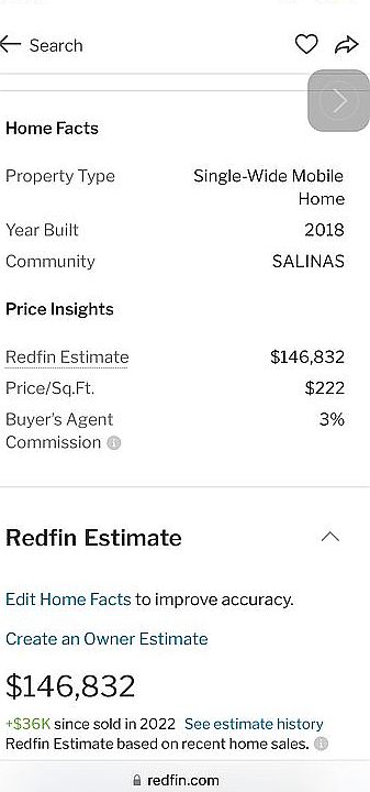 This beautiful mobile home is ready for you to move in! I purchased this home earlier this year; but, ended up working in the Bay Area and I am unable to live here full-time. According to the park manager it needs to be full-time occupied by an owner. Because of my job situation during Covid, I am not able to be home every single night. For this reason, I am interested in selling my home (either 50% or the whole entire place). Master bedroom downstairs and a loft space upstairs - perfect second bedroom. Nice granite kitchen, bathroom, and recently installed luxury European washer and dryer. It’s about 10 minutes from Natividad hospital. Very close to stores, schools, church and library! There is room to park 2 cars in the driveway and possible street parking for another one in front of the house. Note: In order to purchase this property you will need to be approved by the park management and fill out an application with them. (You will need to meet the park’s minimum income requirement of at least $3,500-$4,000 per month. This home is part rent and part own.) The land underneath the home is rented from the park management. The land costs about $1000 a month rent and utilities to the park. The home is for sale for $130,000. Usually a down payment is about 10 to 20%. If you cannot afford this type of down payment and want to arrange some thing with me please send me an email through Zillow. The mortgage and interest on the home will be approximately $1,500 per month until it is paid for… not whatever Zillow shows. About a loan for the home: Because it is difficult to get loans and I enjoy helping people get settled in life… I am willing to carry the loan for you at the same 10% rate that was offered to me by a mobile home mortgage company and personal loaner. Please call me or email me and let me know your situation and why are you are interested in buying this tiny home. The mortgage and interest on the home will be approximately $1,500 per month for about 10 years (instead of 30 like traditional banks) until it is paid for. Total cost for the whole home plus the rent to the mobile home park per month will be approximately $2500. If you are just starting out and interested in purchasing a partial ownership such as half the home or something like that please email me to discuss further. I really love this little home and I hope that she soon has another owner that will love her just as much as I do. Please have your credit score be 700 something. Please email me for photos of the inside: I was adding in Redfins home estimate and it deleted all the photos. I have not put new photos back on Zillow yet. When emailing please confirm making over $3,500 per month to qualify for the parks a minimum income requirement. Thank you. Note: If you have a realtor the commission fee will be added to sales price. Measurements are approximate, buyer to confirm square feet.