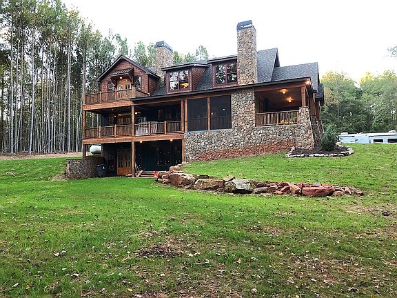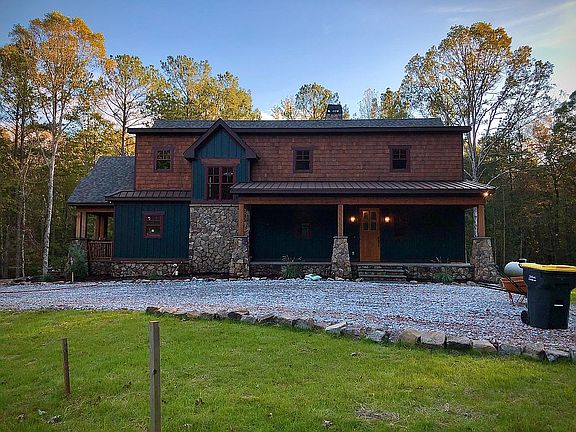 11.9 mostly wooded acres. Rushin Creek crosses rear of property. 25' x 36' barn and 16x24 storage building. Craftsman style, timber frame home.