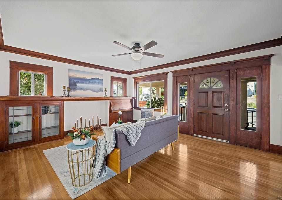 Charming Craftsman home that has been freshly renovated while preserving its original character. Bright and airy throughout, this home showcases beautiful original wood accents, including crown molding, built-ins, and detailed door and window frames. The original wood floors add warmth and authenticity to every room. The large, open kitchen features two-toned cabinets, a custom backsplash, and all new stainless steel appliances. A spacious dining room is perfect for gatherings, and the updated bathroom includes dual sinks. The laundry room offers additional storage, and the home sits peacefully on a quiet cul-de-sac. The backyard’s natural elevation presents an ideal opportunity to create a deck or viewing area to take in the surrounding views. Mature palm trees in the front complete the curb appeal of this tastefully updated home that perfectly blends classic charm with modern comfort.