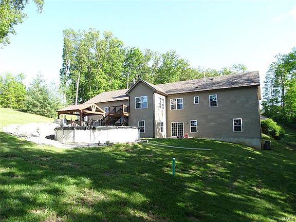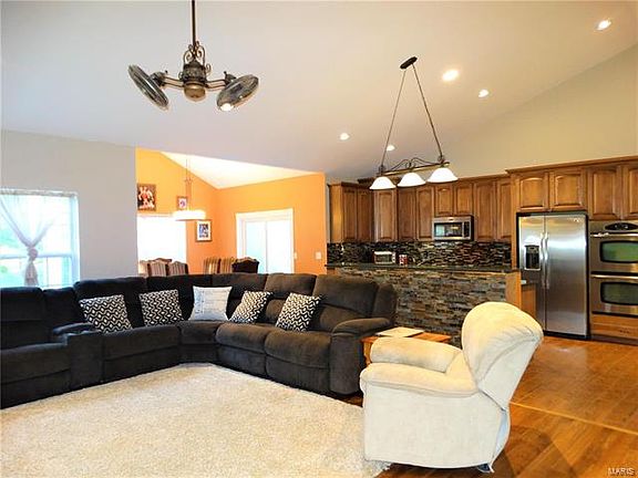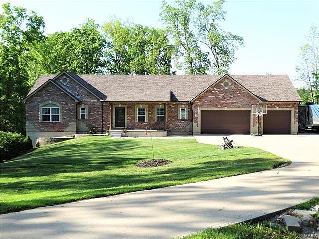 Quality custom built, one owner ranch home sitting on 3 acres in Jefferson R-7 schools. 5 beds & 2 baths. Home is at the end of a cul-de-sac. Brick & Stone front w/led flood lights to shine down & highlight the stone. Covered front porch, 3 car garage w/additional RV or boat parking. Home features 9' ceilings through out. Slate entry way that leads to open living room w/wood floors & vaulted ceiling & a spectacular arch & stone wall w/built in shelves & plenty of electric. Kitchen features Sile Stone counter tops, stainless steel appliances, 42 custom cabinets. Dining room has vaulted ceilings, lots of windows & double door that walks out to deck & covered stamped concrete patio. Huge master suite w/full bath & large walk in closet. In the kitchen & the hall bath you'll love the led wireless speakers. Finished w/o lower level features 2 large bedrooms. Home has 400 amp service & wired for a generator. Wood burning furnace. Old fashion street lights light up the driveway. So much more!