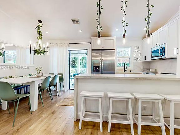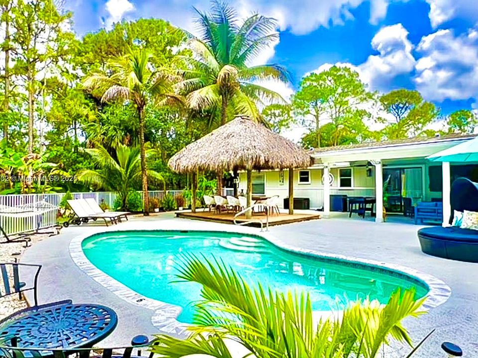 Welcome to Villa Las Palmas — the kind of place that makes you want to take off your shoes, pour a drink, and never leave. Nestled on 1.16 acres of lush, tropical land, this 4-bedroom, 2-bath home has been completely transformed into a bright, modern escape. Step inside and you’ll immediately notice the fresh paint, the rich new flooring underfoot, and a kitchen that looks like it belongs in a design magazine — brand-new appliances, crisp white cabinetry, and waterfall countertops that are as durable as they are stunning. But where this home really shines is outside. Whether you're floating in the sparkling pool, lounging under the brand-new custom gazebo, or picking bananas from your own trees, you’ll feel like you’re on a permanent vacation. This is not just a home it's a lifestyle.