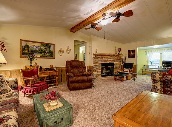 Meticulously maintained, fully furnished, 3 bedroom, 2 bath manufactured home with spacious living area featuring beautiful new stone fireplace with cedar log mantel, functional kitchen with dining area. Master suite features full bath with large garden tub. Some recent updates include a new metal roof, new central heat and air unit, new flooring throughout the house, freshly painted interior, all new window treatments and more...Plenty of room for storage, 2 additional store rooms as well as shed and detached carport for covered parking. Front and back screened porches as well as nice open deck. Level yard with plenty of room for small garden, easy access and a short drive to town.