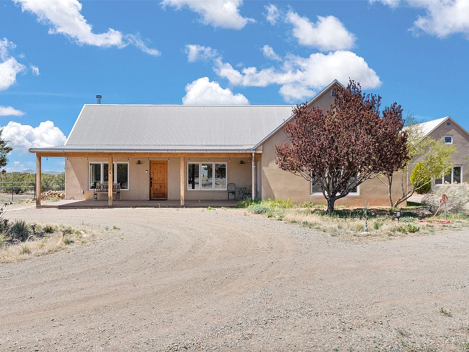 Rare Santa Fe horse property located 15 minutes from the Plaza. Enjoy spectacular Sangre de Cristo views from this northern New Mexico style pitched-roof and AER-block masonry-constructed house and guesthouse. Enter the spacious portal into a warm open floor plan with diamond finished plaster walls, lofty ceilings, and stained concrete floors throughout. The generous ensuite primary bedroom has nice separation of space from the guest bedroom/office and three-quarters bath. From the back portal enjoy views of the Jemez Mountains, the Caja Del Rio Plateau and the Sandia Mountains. The detached guest house has a kitchenette, bath, sleeping loft, portal with views and a private fenced yard. The 2.5 horse friendly acres are located on a high flat meadow with a pipe corral, 12x24 lean-to and a second 12x24 lean-to with attached 12x12 tack room and trailer parking. AER-block construction provides excellent insulation, mass and integrity to the structures and winter comfort is insured by natural gas-fired in-floor radiant heat, Levolor energy efficient window coverings and a wood burning stove in each house. A peaceful and quiet setting with an abundance of wildlife. Hiking and riding trails nearby. This special property is off Camino La Tierra northwest of Santa Fe and is not part of an HOA.