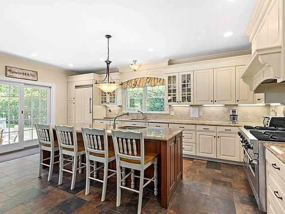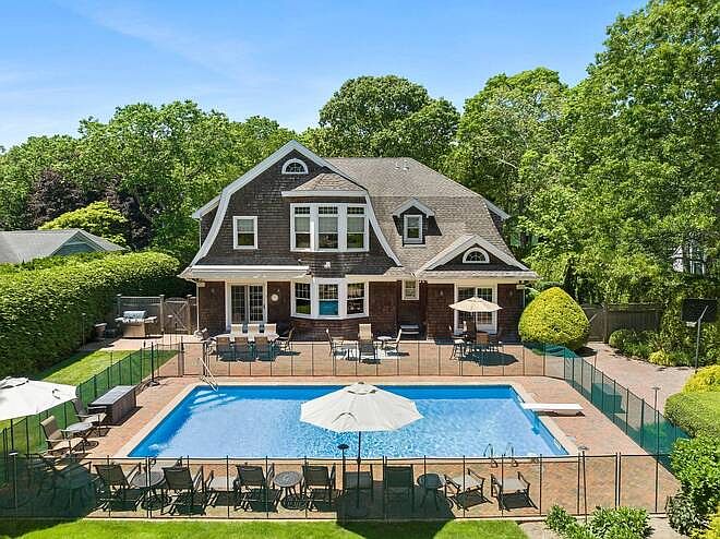 Your Westhampton Beach village home awaits! Set on nearly two thirds of an acre, this meticulously maintained and fully equipped smart house has it all! Upon entering the home, the vaulted ceilings lead you into a formal living room with natural light and a gas fireplace. Around the corner sits a large dining area with a tray ceiling and custom woodworking throughout. At the heart of the home, the eat-in kitchen includes a comfortable den with built-in cabinets and offers oversized windows and a sliding glass door with views of the pool and sprawling lawns. The spacious kitchen features granite countertops, a Viking 6-burner range, Viking refrigerator, 2 dishwashers and 2 sinks to name a few. The first floor also includes an en-suite bedroom with vaulted ceilings and sliding doors to the backyard. Up the stairs you can find the grand primary suite with jacuzzi tub, cathedral ceilings, a walk-in closet, and views of the backyard. There are also 3 additional guest bedrooms, two bathrooms and a sitting area with built in cabinets. The basement also includes a bedroom, bathroom, office and sitting area with ample closets and storage space. Outside, the back patio offers a hardlined gas grill, multiple outdoor dining and living areas, and a retractable awning for shaded relaxation on hot sunny days. Continuing on, you will find the heated saltwater pool with the option to be additionally fenced in with plenty of space for more seating and lounging. Additional features include new AC units, a whole house generator, crestron system with indoor and outdoor audio, and insteon lighting system. With the mature landscaping, sprawling lawns, speakers and lighting outside, you can truly enjoy the tranquil backyard both day and night.