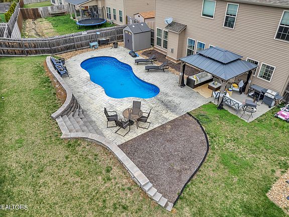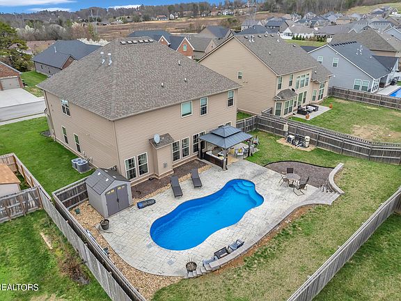 This beautiful home includes over $100,000 of upgrades completed by the current owner! Built in 2018, this stunning property is equipped with a recently installed saltwater in-ground heated pool with stamped concrete surround, stone retaining wall, gazebo, professional landscaping and landscape lighting. It is conveniently located in heart of Maryville and zoned the award winning Maryville schools; Foothills Elementary, Montgomery Ridge Middle & Maryville High Schools. Step inside the front door to modern LVT flooring, an office to the left, and in front, an open concept living room, dining room and kitchen space. The kitchen features a spacious island, Frigidaire professional grade stainless steel appliances, granite counter tops, a large walk in pantry, and windows overlooking the gorgeous backyard & pool. Planation shutters throughout the entire main level have been installed adding to the custom feel of this home. Walk upstairs to the second level which opens up to a large bonus space which can be used as a 2nd living room! In addition to that space, the 4 bedrooms are spacious with large closets. The primary suite upstairs features an oversized room, large walk in closet, large ensuite bathroom with walk in shower and soaking tub! This is one home you do not want to miss!