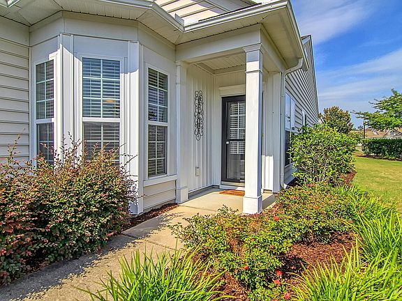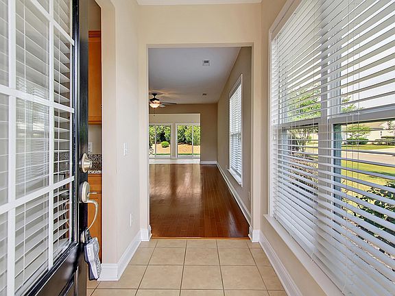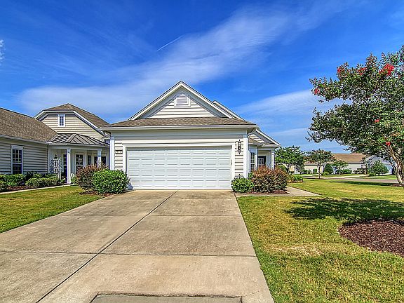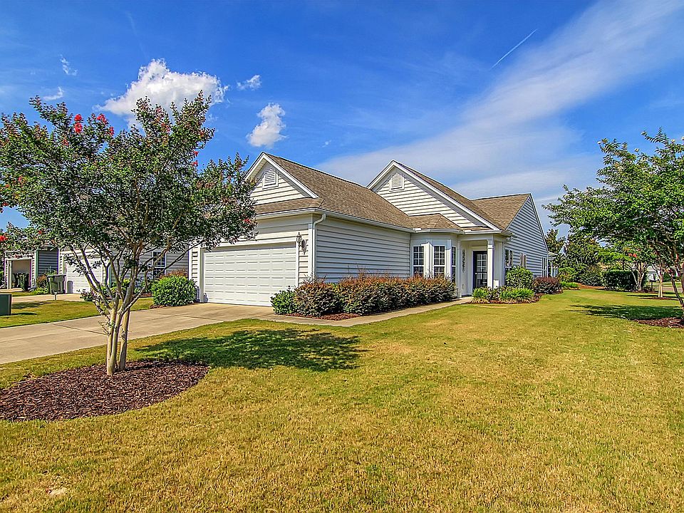 Popular Gray Myst floorpan in Charleston's premier Active Adult community, Del Webb Charleston at Cane Bay. Corner homesite with landscaped berm offering great proximity to the community's amenity center. Open-concept living with 3 bedrooms, 2 baths, eat-in kitchen, dining and great room combination, sunroom and pergola! Step inside to a defined foyer, from there a nicely sized kitchen featuring tile flooring, granite countertops, Stainless steel appliances with gas range, Birch cabinets, tiled backsplash, built-in desk with upper cabinets, and eat in kitchen with bay window. The entry from the garage is just off the kitchen, an ideal location for easy unloading after the grocery store. Hardwood flooring continues through the great room/dining room, hallways, and 3rd bedroom/den/office...and tiled flooring in the sunroom. The primary bedroom is situated at the back of the home offering beautiful landscaped views with privacy. Primary bathroom features a double sink vanity, tile flooring, walk-in tiled shower with glass shower door and large walk-in closet. The guest bedroom, bath and office/den/3rd bedroom are down a separate hallway, giving both the owner and guests maximum privacy. *The carpet needs to be replaced in the primary and guest bedroom* Also down the hallway, you will find an oversized storage and linen closet. Rounding this one out, a beautiful light filled sunroom with double French doors takes you to the Pergola highlighted with a manicured maintenance free berm for privacy. All appliances convey and available for a quick closing! The opportunities for a home priced under $350,000 in Del Webb Cane Bay are very limited, please book your showing today!