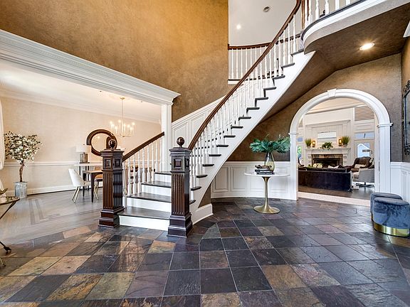 Absolutely stunning entertainer's dream home w/cathedral ceilings, spiral staircase/entry foyer, extensive crown molding thru out, formal dining & living or music room, gourmet kitchen/stainless appliances/huge island w/new quartz, 2 primary BR's(one up and one down), full finished b'ment w/5th BR or office/FP, new paint/refinished hardwoods, new light fixtures, security system, covered deck w/new awning & covered patio, irrigation, in-ground pool w/new liner, 3-car garage, tons of storage!