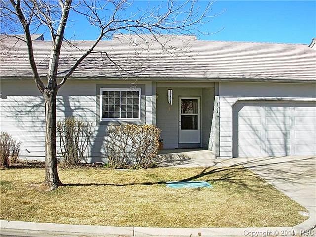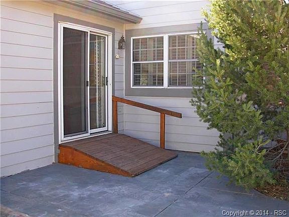 Light, bright & open ranch plan in Cobblestone w/attached 2-car garage. Bermed hillside behind for privacy but views of Cheyenne Mountain. A perfect setting! The large stamped concrete paved patio w/privacy wall is ready for the warmer days ahead. Upgraded with plantation shutters, red oak hardwood plank floors in main living areas, California closets (some cedar), stainless appliances (1-2yrs), heated towel racks in master bath & painted in the last year or two. The great room has vaulted ceiling, bookshelves, ceiling fan & moss rock wood burning fireplace. The dining room has slider to large stamped/paved patio w/privacy wall & fence. The kitchen includes all stainless appliances, breakfast bar & abundant cabinets. Large master w/2 closets & adjoining bath. Add'l bedroom & bath on main level. The lower level has family room & bonus room, full bath, laundry room w/washer & dryer, large bedroom w/large cedar lined California closet w/tile floor. The complex is well maintained w/a community pool. Easy access to shopping, parks, Fort Carson, the Broadmoor & Hwy 115.