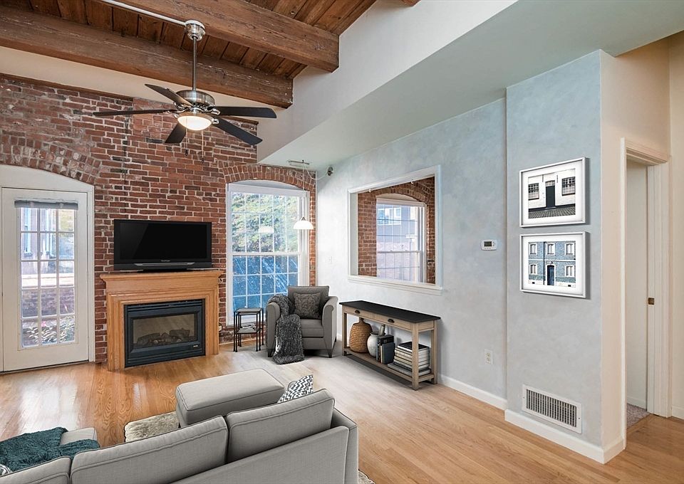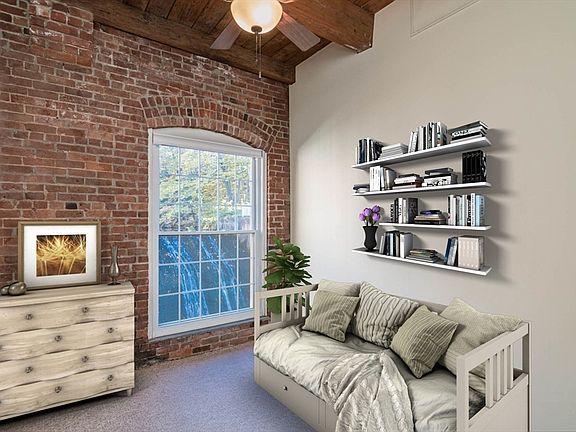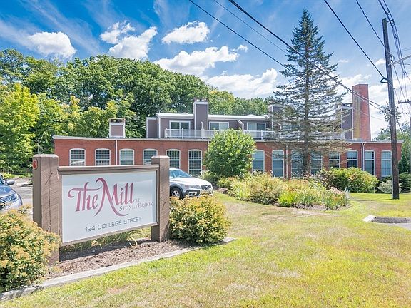Rare Garden style condo with patio and waterfall view at "The Mill". This charming unit has an open floor plan for the living room, kitchen and dining area with exposed brick and beams as well as oak hardwood floor and an amazing view of the waterfall.The large primary bedroom suite with full bath has abundant closet space and also has patio access.The second bedroom which could also be a den or office has a waterfall view as well. The location is is walking distance to the center and Village Commons.......A must see!........South entrance over bridge.