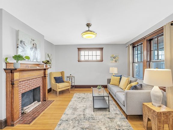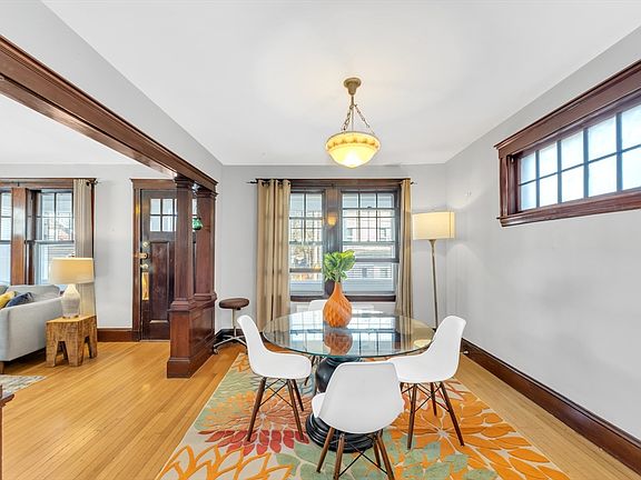 Welcome to this wonderful expanded bungalow! As you enter, an over-sized enclosed porch invites you into the gracious living room and formal dining room. Both rooms feature Craftsman original detail and beautiful gum-wood molding, creating an inviting atmosphere. The living room is accentuated by a wood mantel over the pretty ornamental fireplace.The large eat-in kitchen offers plenty of counter space and stainless steel appliances, with room even for a small table. A convenient full bath and a tucked-away home office add to the functionality of the main floor. Upstairs, the second floor boasts three bedrooms, two of which have hidden closets within. The tastefully renovated, large tile bath includes built-in storage for added convenience. Outside, the landscaped yard with perennials, native plants, and a serene patio provides a perfect setting for entertaining. Located minutes from vibrant shops & restaurants of Roslindale square, George Wright golf course and transportation.