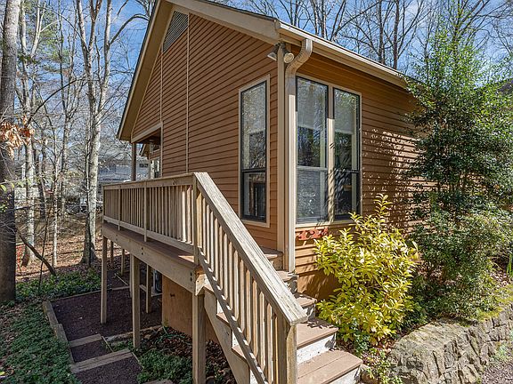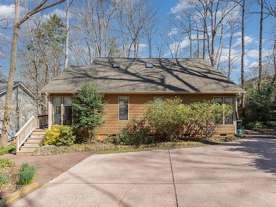 This spacious, architect-designed, contemporary home is being offered for sale by the original owners. Four bedrooms, three and one-half baths. Entry foyer with tile flooring. Living room features a fireplace with a woodstove insert. Living and dining rooms have vaulted ceilings and hardwood floors, plus glass sliding doors to the wrap-around deck. Kitchen features a gas stove and a tile backsplash. Family room has a convenient pass-through opening to the kitchen. Two bedrooms and a full bath on the main level plus a laundry room and a half bath. Upstairs there is the primary bedroom suite with good closet space and a private, sky-lit bath with two sinks and a tile shower, plus a loft/office area. Lower level has the fourth bedroom or bonus room and third full bath. Screened porch. Detached studio with plumbing and HVAC could also be a home office space or in-law suite. Wooded setting with stone retaining walls, perennial gardens, blooming shrubbery. Neighborhood pond and playground.