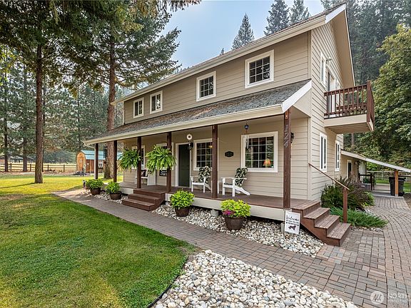 Seeking quiet country living just 2 miles from downtown Leavenworth? This idyllic, farm-inspired home sits on nearly 3 acres with over 2,800 sq. ft. of well-maintained living space. Park-like irrigated grounds feature a fenced backyard, an artist’s studio, and both a sweet front porch and a lovely rear patio—perfect spots to begin and end your day. The main level offers a generous living room, three bedrooms, two bathrooms, and an open kitchen/family room. Upstairs, the sunny primary suite boasts a 5-piece bath and a walk-in closet. The fully permitted studio is perfect for creative projects or a future bunkhouse. Tucked in serene Eagle Creek Canyon, this property offers the ideal backdrop for peaceful mountain living.