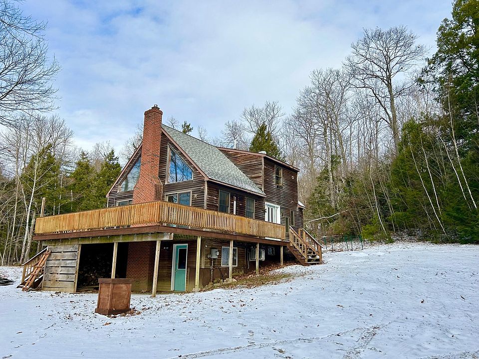 Here we have a 2 bedroom, 2.5 bath Chalet in tax friendly Benton. Large sunny living room with vaulted ceilings flows into the kitchen and dining room elegantly. One bedroom on the main floor and owner suite with large bathroom on 2nd floor. You can enter the wrap around deck from the sliding glass doors in the living room and overlook the large and secluded 1.68 acre lot. The deck was recently stained and repaired. This wonderful home also has a heat pump to help offset oil prices and will also keep the home cool in the summer. A 3rd bedroom can be easily finished in the walkout basement.