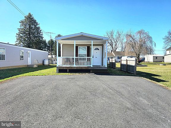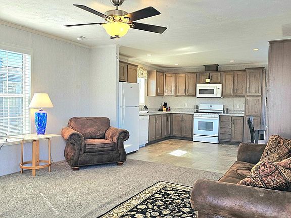 A modern mobile home featuring 2 bedrooms and 1 bathroom, equipped with central air conditioning. It boasts an open concept living area with ample cabinet space, and the bedrooms are both spacious with large closets. Covered front porch to relax on. Additional upgrades include improved lighting and ceiling fans. Situated in a quiet location, the lot rent is a reasonable $410.00 per month, which includes lawn care. The home also has a brand new back door and only occupied by 1 person since it was built !