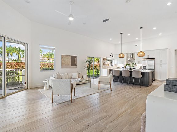 This one-story, 3-bedroom, 2-bathroom home with a 2-car garage offers 2,003 square feet of beautifully appointed living space in the gated Eagleton Lakes neighborhood of PGA National. Wood-look ceramic tile and a soft ivory palette flow throughout the open-concept floor plan, creating a bright and welcoming atmosphere. The spacious living and dining areas are complemented by a chef-inspired kitchen with crisp white shaker cabinets, quartz countertops, stainless steel appliances, and a contrasting walnut-toned island with seating. The primary suite features vaulted ceilings, dual closets, and direct access to the covered patio, while the en-suite bathroom offers a birch wood dual-sink vanity and floor-to-ceiling marble-look tile surrounding the shower and soaking tub. A second bedroom serves as a versatile office, and the guest bedroom is light-filled with ample closet space. Outdoors, a screened covered patio and open terrace overlook a fully fenced yard and serene lake, providing an ideal setting for relaxation or entertaining. This home effortlessly blends style, comfort, and functionality in a sought-after PGA National community.