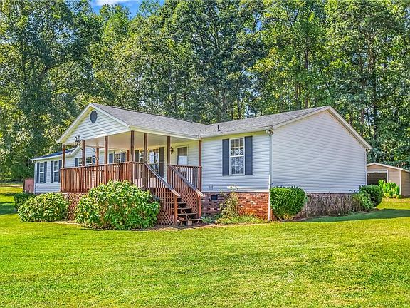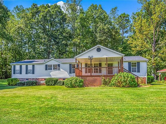One-level rural living on .69 acres in Pilot Mountain! This spacious 4 bedroom/2-bathroom manufactured home has tons of room to grow. Enjoy country views of the manicured yard from the large, covered front porch. An open floor plan allows for great entertaining- featuring a living room, dining room, kitchen, and large den. The den has a beautiful, stoned FP w/ gas logs. The primary bedroom includes double closets and an additional space perfect for a nursery, office, or sitting room. The primary bath has double sinks, garden tub, and separate shower. The laundry room is conveniently located at the back entrance and has cabinets for additional storage. Outside you will find plenty of additional storage with 2 buildings and 2-2 car carports. The new roof was installed in 2021. Only 2.5 miles from JOLO Winery & Vineyards! Shared private road and shared well. No septic or well permits found-per Surry County.