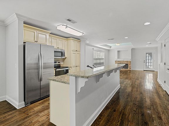 Electric fireplaceCrown moldingHardwood floorsDeck accessCovered front porchOpen floor planLevel backyard