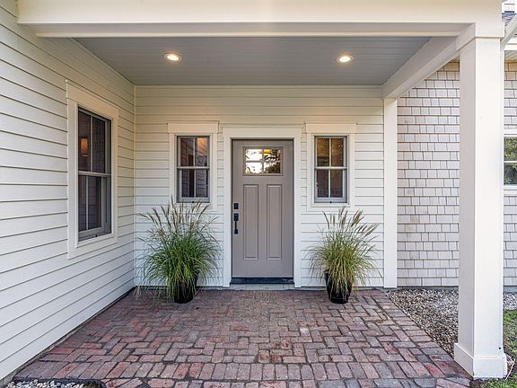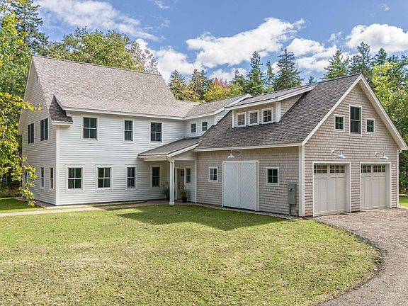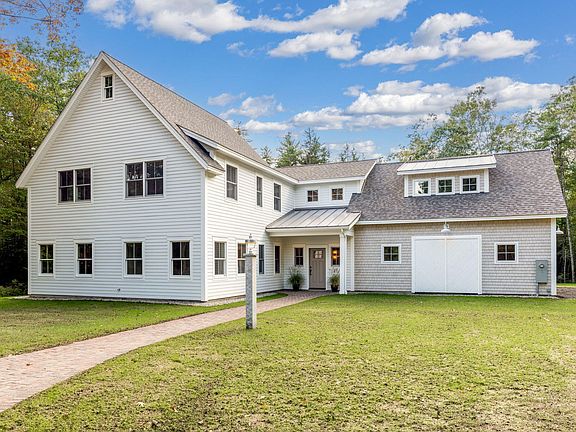 This truly remarkable new home, just completed by Jackson Built, is set back on a beautiful lot and nestled amongst the evergreens. The flowing floor plan features open yet defined rooms. Home chefs will love the gourmet kitchen with GE Cafe appliances including a 36 inch dual fuel range, painted maple cabinetry, quartz counters, an expansive island, and a pantry with glass pocket door. Special features include a bar with beverage refrigerator in the dining room, brick fireplace with gas stove in the living room, and library nook with built-in bookcase just outside the den. Gorgeous first-floor bath with custom-designed quartz vanity and tiled walk-in shower. Striking design elements such as reclaimed antique beam accents, distinctive lighting fixtures, unique wallpaper accents, and high ceilings compliment the home's impeccable design. Exquisite primary suite with double sliding barn door leading to dual walk-in closets and a stunning bath with large tiled shower and double vanity with marble top. The laundry room with built-in LG WashTower, quartz counter and marble tile floor is worthy of a magazine feature. An extra wide hallway connects to the additional bedrooms and guest bath. Well insulated for efficiency with radiant heat downstairs and Hydro-air heating and air conditioning upstairs. Unfinished space over the 2-car garage is perfect for storage or may be finished into a bonus room or guest space. An automatic whole-house generator is included. Low maintenance exterior with HardiePlank siding, Azek trim, and 50-year roofing shingles and metal accents. Wrap-around porch with brick patio overlooking the private back yard with access to Freeport Conservation Trust trails extending to Wolfe's Neck Center's vast trail system. Simply a must-see property.