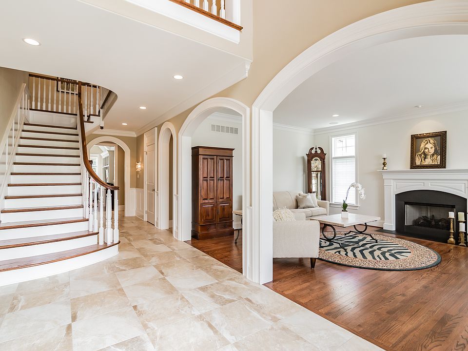 This stunning, professionally decorated "Pembrey Model" home has been upgraded & is move-in ready. Double doors open to the 2 story Foyer & lead to the formal Living Room with bay window & granite surround fireplace. Arched entryways open to the Dining Room with dramatic accent lighting, LED lighted Wine Cabinet, Butler Pantry with wet bar, wine refrigerator & custom cabinet display for ease in entertaining. The Center Hall, with porcelain floor offers a Guest Coat Closet, formal Powder Room & new Elevator to all levels of this spectacular home. The open floorplan boasts a stunning Great Room with vaulted & beamed ceiling, Stone Fireplace with gas insert & built-in entertainment cabinetry. The Gourmet Kitchen boasts abundant cabinetry, large marble island, 42" Viking Refrigerator, Viking Professional 5 Burner Cooktop, Miele double ovens & Miele dishwasher & opens to the sunny Breakfast Room with French doors onto the deck with stairway to the lower patio & overlooks the rear green space. French doors open to the Office/Study with solid wood built-in cabinetry & walls of windows. A spacious pantry closet & utility closet, plus a Solarium, perfect for your Perennials opens to the 2 Car Garage. The sweeping stairway from the Center Hall leads to the 2nd floor with hardwood floors & offers a luxurious Master Suite with a Dressing Room, built-in Vanity Table, His & Her Walk-in Closets, Spa like bath, with heated floor, spacious Shower with built-in seat & double shower heads, Soaking Tub & double Vanities. Bedroom 2 with walk-in closet & full Bath & Bedroom 3 with double closet & full sky-lit Bath. The Laundry Room with sink & cabinetry completes the 2nd floor. The walk-out Lower Level reached either by the stairway or the elevator, offers a 102 /- inch projection Theater, built-in Bar with wine cooler, sink, dishwasher, refrigerator & is bright with many windows & French doors to a large patio with built-in bar-b-que & spacious, covered dining area. The Gym with rubber
