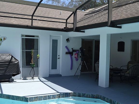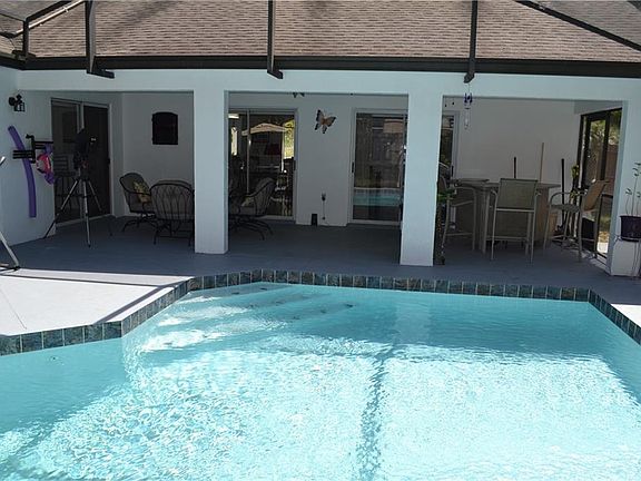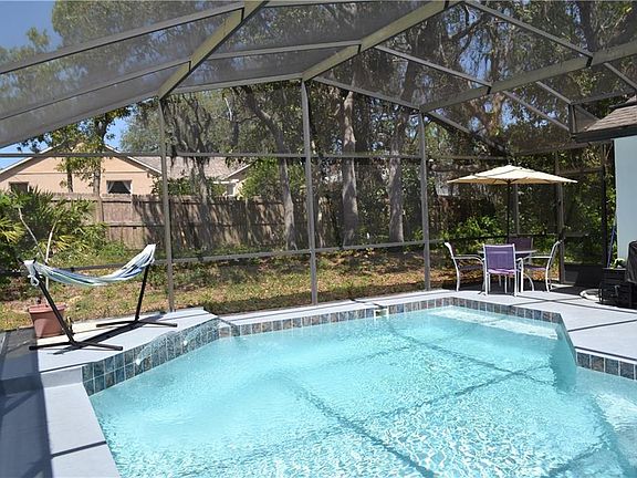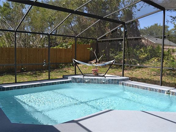 Home is ready for a new owner that is looking for CLEAN, NICELY DECORATED OPEN FLOOR PLAN. Welcome home to 12 ft vaulted ceilings with an open concept great for entertaining around living/dining and family room areas with a semi custom L-shape plan. Between the Formal living room, dining room and family room with the kitchen in the center lends for perfect gatherings. All areas have plenty of windows and sliders to allow the pretty view of the pool. The family room boasts a huge bay window and 2 skylights for natural lighting. Th kitchen situated in the center as mention for socializing with guests while cooking in a completely renovated kitchen with all new tasteful 42 inch nuetral cabinets, upgraded counter tops,with plenty of catering area with the breakfast bar. All top of the line stainless steal appliances awaits that perfect chef for a pleasurable time for cooking. Pool time is the best time, to soak up in a newly resurfaced beautiful pool with the delightful sun by day and soft lighting for that evening swim. Did I mention the huge covered patio to shade you from the Florida Sun with plenty of room for grilling. Plenty of deck surrounds the pool for lounging in the Sun. The back side of the pool and patio faces natural wooded area with a privacy fence behind giving you the feeling of a conservation lot, because of all the mature trees. The soft color of the recently painted walls adds to that bright feeling inside, lavished with trending soft neutral tiles through out the entire home to compliment the natural lighting this home offers. If you like soft bright open living, you will have it in this home. The master bedroom retreat is a wide open area which accommodates a king size bed with large furniture if this is your style. Also offers the convenience of His and Her closets. The master on-suite is newly renovated with beautiful vanity cabinetry, dual sinks and upgraded counter top with design window for natural light during the day and a cozy