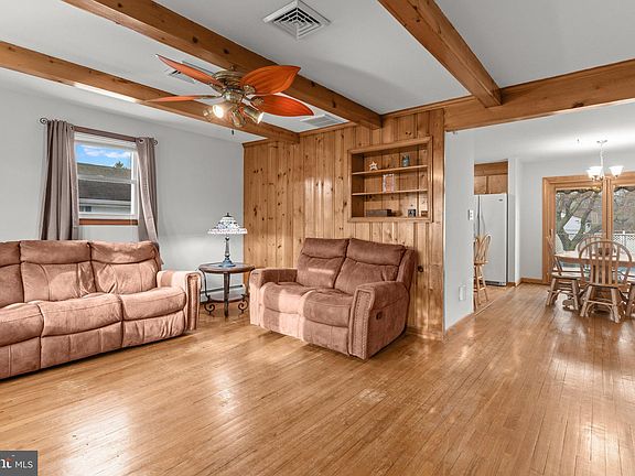 The stone front façade, hardscaping touches, replaced Pella front door, replaced windows, plus a 3-car deep driveway, welcomes you. The quality of construction in this raised ranch shines through! One inside, oak hardwood flooring and a charming beamed ceiling greet you in the Living Room. With bay windows replaced in 2024, built-in display shelving and a tv-height wall outlet in place, furnishing this room will be a breeze. Enjoy the views of the rear yard through top-of-the-line replaced Pella sliding glass doors with built-in blinds and a hidden screen door insert in the Dining Room. A newly installed modern chandelier hangs over the dining table, perfect for get togethers & stool seating was added at the peninsula countertop. Tons of wood cabinetry are provided, along with double ovens and a side-by-side frig with water/ice maker. Neutral Corian countertops, a double sink with window and accent lighting above, plus under cabinet lighting and a neutral ceramic tile lined backsplash add a great touch. A Pella replacement door leads to the side driveway for convenience. The other side of the freshly painted Main Level offers a coat closet, 3 Bedrooms and a full bath. The Master Bedroom is impressive in size with a double closet and dual replacement windows with custom dark-out blinds. The 2nd Bedroom has a deep closet & the 3rd Bedroom has double windows. Each of the Bedrooms boast hardwood flooring, upgraded ceiling fan/light fixtures and stylish curtains. The full Bath has spring-time purple tile accents in perfect condition, a shower/tub combination, window and linen closet. Providing an additional 660 sq ft, the 36’ long finished Basement is open but laid out as 2 areas. The Game Area encompasses a pool table with classic overhead light. All of the extras, like a cue rack and wooden beads for score keeping, are included. The Family Room has a 13’ wide stone accent wall with a gas-fueled DECORATIVE fireplace with track lighting. A ceiling fan/light fixture, built-in speaker wiring and a 2nd zone of heat are features of this bonus space. A 13’x11’ Laundry Room has a wall of cabinetry, stainless sink and a retractable clothes line. Also on this level is: a Workshop housing the replaced heater, workbench, tool peg boards, multiple closets, built-in shelving, a brand new 200 amp electrical panel box and a Powder Room! Right next to a door that leads up to the rear patio, a retro blue/white Arabesque tiled Powder Room is sure to be hit when partying in the Basement or the pool. The rear of the home has a long patio with a 2nd awning. A fully-fenced pool will provide hours of entertainment! Opened and fully-functional last year and ready to be opened by the Buyer post-settlement, this 17’ wide by 35’ long in-ground pool had plaster replaced in 2023. There is a winter safety cover, solar cover, vacuum, chemicals and supplies that are all included. A pond with large koi fish and waterfall is running and beautiful. Attached to the main home are multiple sheds with shelving and electric. The roof is just 10 years young and benefits from a Vivant Solar Panel System which transfers to the Buyer. Economical dual-zone natural gas hot water baseboard heating with an upgraded electronic programmable thermostat on each level. Central air. This home is deep in suburbia, yet just minutes to major cities, airports, train stations and shopping. Quick walk to bars, dining, a Dog Park, fun events at the Delaware River and biking along the Canal. Historic Morrisville is home to Summerseat, George Washington’s headquarters during December 1776, which is owned by 2 signers of the Declaration of Independence. In a town celebrated for its historic events & community feeling, you’ll feel right at home at 124 Harrison Ave! Sellers have completed the extensive list of Use & Occupancy Requirements, including the sewer scope. This home is MOVE-IN READY! Here is your chance to live your summer dream!