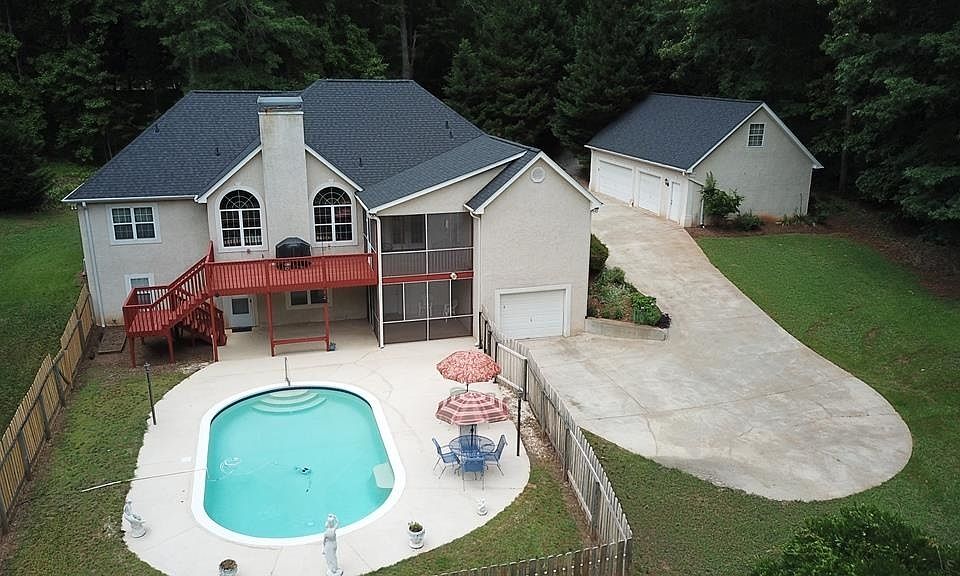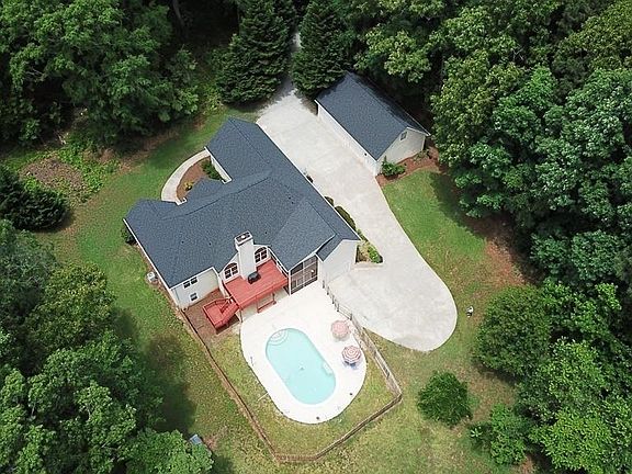 Location & Privacy Galore- Beautiful One Owner, 5 bedroom & 4.5 baths, 3852 square foot home that sits on 4.75 acres & has lake access w/ two adjoining lakes. Hardwood floors & tile throughout. Corian countertops, jacuzzi tub in the main bath. Two screened porches & a deck that overlooks the Gunite pool. There is a mother-in-law suite that would be perfect for multi families, or rental income. Double car garage on the main floor, single drive under downstairs, and a detached three car garage. Full bonus room above the detached garage that could be finished for even more space. The garages are great for the car enthusiasts and workshop. There is a wonderful space downstairs that could be a perfect game room or additional bedroom. Access to a downstairs bathroom straight off the pool deck. Best school systems in the area for your children. Minutes from shopping, entertainment plus close access to the interstate & airport for travel. Location location location!