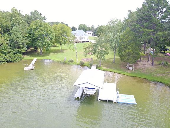 Custom built home on enormous level peninsular lot. This home boasts 9ft ceilings on the main level and soaring cathedrals in the great room. Beautiful Fireplace centering the main channel lake views. This open floor plan home lends itself to entertaining through the open kitchen which has gigantic slabs of granite covering gorgeous white cabinetry. The main level houses the master suite and a guest bedroom. All ammenities are on the main level with comfortable office. Upstairs are two large bedrooms and two baths. Several french doors lead out to an enormous deck overlooking the lake. 3.56 Acres of usable land including TVA property has with roughly 1350 ft of shoreline. Includes Two permitted TVA docks with one on deep year round water. RV Shed, Tool shed and a lake room with bath