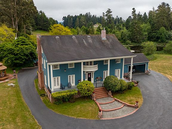 History, Privacy and Nature at its finest all while being conveniently located between Eureka and Arcata. This stunning Estate on 13.56 acres has been lovingly cared for, kept in its original charm but also features many modern day amenities. Formerly built and owned by Dr. Charles Falk, Nephew of the Founder of the historic town of Falk. This nearly 5000 Sq. Ft. stunning Colonial home features 5 bedrooms and 5.5 baths. On the main level you will find a formal foyer with dramatic grand staircase, exquisite living room with coffered ceilings, numerous French Doors and built-in's, separate Den with built in bookshelves, gas fireplace and rock hearth. The circular Formal dining room is spacious and offers French doors leading to the brick patio. The functional kitchen features ample