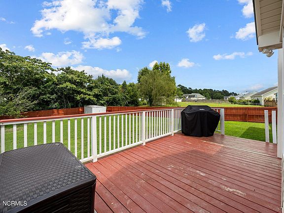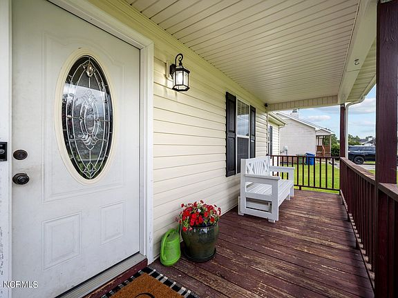Welcome to this charming, well-maintained home that offers a wonderful opportunity to live in the established neighborhood of ''Kanton Ridge.'' From the moment you walk in the front door, you will appreciate the the character of this home. With vaulted ceilings, a cozy fireplace, and LVP flooring, the family room segues nicely into the eat-in kitchen with dinning nook for open-concept living. What helps to distinguish this home from others similar to it is the formal dining room with matching LVP floor and elegantly accented chair rail moulding to enhance dinners with family and friends for years to come. The large primary bedroom has plentiful natural lighting and an ensuite with double vanities, a tub/shower combo, and a walk-in closet. Conveniently located, the laundry room closet is just off the conditioned two-car garage. In addition, there are two other nicely-sized bedrooms and a full guest bathroom. Adding to this home's appeal is a new roof in 2024 and a new HVAC in 2018. Equally impressive to the inside is the outdoor space, which offers a covered rocking-chair style front porch and a fenced-in backyard with a storage shed and a raised deck to extend your indoor living outdoors for entertainment and/or relaxation year round. Further, this home sits just twenty minutes from the Albert J. Ellis Airport for easy travel access and ten minutes to the heart of Jacksonville for shopping, dining, and entertainment. Finally, you will be approximately twenty-five minutes to North Topsail Beach and one hour to the Crystal Coast beaches of Emerald Isle for those day trips of fun in the sun fishing, boating, swimming, and shelling.