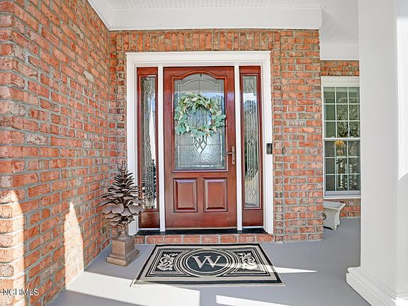 Breathtaking mile wide views from this stunning WATERFRONT home. Nestled on a high bluff, your dream home in the Friendly City By the Sea awaits your arrival. Popular floor plan consisting of 4 bedrooms with ensuites , open kitchen to breakfast and living area, formal dining, large office, and a bonus room. All living areas and primary bedroom on main floor. Guests and bonus room on second floor, make this a great living arrangement for a couple with guests or a large family. Exceptional features (See Special Feature List in Documents): chef's dream kitchen with custom cabinetry , second island with prep sink, stainless appliances, gas cook top and double ovens. An abundance of glass from all living areas and primary bedroom offer stunning views. Nine foot ceilings with 12 foot vaulted in living and primary bedroom. Primary bedroom has large ensuite with walk in shower, jetted tub, huge walk in closet, separate vanities. Beautiful trim with custom shelving throughout. Lots of closets, double pantry, walk in attic, and an over sized garage. Large screened porch , wrap arond deck, brick accessory building for grills, emergency generator. Concrete dock with covered area and a 7000 lb lift. Located in the White Oak Crossing neighborhood, offering a boat ramp, day dock, community pool, and a private premier ( optional membership) raquet club. Just minutes to downtown Historic Swansboro by boat or car, 15 min to Emerald Isle beaches, 5 min to Hammocks Beach State Park. Your coastal living lifestyle awaits.