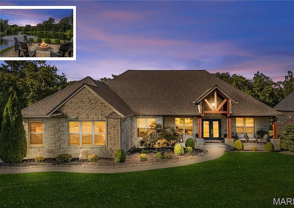 Experience tranquil lakeside living at 124 Long Branch Ln, a custom home where every detail has been thoughtfully considered. This elegant retreat is situated on a private 1-acre lot in the top-rated O'Fallon school district (K-12), offering a perfect blend of peacefulness & convenience to O'Fallon Living. Inside, the open-concept design is highlighted by soaring ceilings, wide-plank hardwood floors, & upgraded window & door trim. Spanning over 4,000+/- finished sqft, the main level features open eat in kitchen with abundant cabinets & countertop space + lake views from nearly every corner, a split-design primary suite with deck access, 2 generously sized bedrooms with a Jack & Jill bathroom, plus a massive hall walk-in closet that can easily serve as a future bedroom or office. A separate laundry room, half bath & side load 3 car garage complete the main level. The finished walkout basement provides a versatile space for entertaining and relaxation, featuring two bedrooms (one currently used as a gym), a full hall bath, a large family/rec room, and a niche for a future bar. There is also an abundance of unfinished storage space. The backyard is pool-ready and includes an amazing lakeside firepit. This is your opportunity to own a home in Turner Farms that perfectly balances refined design with natural beauty and privacy.
