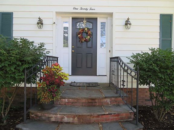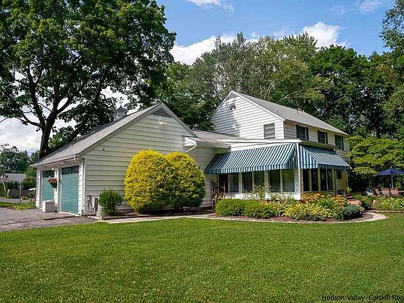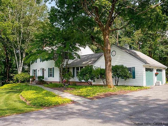 This home welcomes you as soon as you enter! Prestigious Center Hall Colonial sits prettily poised located on one of Uptown Kingston's loveliest streets. Enjoy your parklike paradise with a brook, privacy and peaceful back yard. The entry is spacious and bright with a beautiful staircase. You have a grand living room with brick fireplace to the left and a formal dining room with wainscoting to the right, both rooms have gorgeous hardwood floors. A generous eat in kitchen is off the foyer, dining room and living room. The kitchen has Cherry wood cabinets, pantry, and charming dining area with large windows overlooking private yard. There is also a back entry with laundry room off the kitchen. To complete the first floor when you come in from your attached two car garage you enter an all-season sunroom with pine wood ceiling, slate floors, electric heat and central air overlooking your yard and patio area. Lots of beautiful plantings and a lush setting all around. Off the sunroom and hallway is a half bath with new tile floor, sink and toilet, spacious family room with big bow window, beamed ceiling, sliders to sunroom and wainscoting which leads back to kitchen. There is lots of natural light in this home. Second floor has 3 luxury sized bedrooms all with hardwood floors and two full baths. Main bedroom suite has hard wood floors, walk in closet and full bath with large jacuzzi tub, shower and double sinks. There is a large unfinished basement waiting for you to finish or great for lots of storage. Seldom do you come across a chance like this. When relaxing in your sunroom or entertaining on your patio your view across the brook is a 3.70-acre property which keeps your back yard feeling like you are in the country and private. You will love the convenience of this location to walk to the uptown Stockade district, restaurants, shopping and Trailways bus station. Some updates include half bath, back awnings, some electric, hot water heater, sump pump, garage door, front door, repointed front steps, sewer line from street to home, washer, stove and oil tank in last 5 years. New Central Air in main part of home August 2022. Don't miss out on the opportunity to own your own perfect paradise. Refrigerator works but older and sold as is.