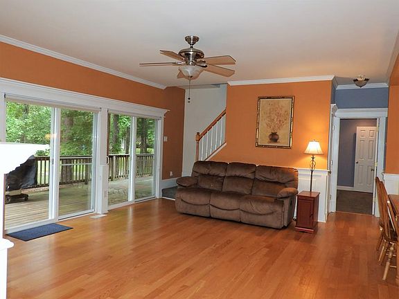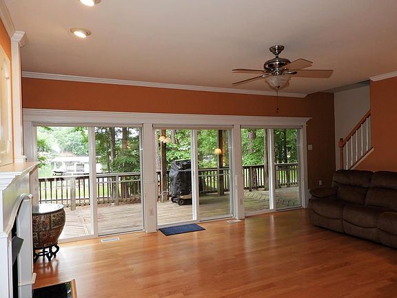 Spacious Waterfront Lake House This traditional 2 story home has approx. 2,007 sqft. An open main level living area w/ beautiful see through fireplace that can be enjoyed from the living room & sunroom. 5 sets of lakeside sliders across the length of the home allowing for lots of natural lighting. Kitchen, Laundry Room, Dining Area & Half BA. Main level master suite with private Master BA. Upper level has 2 add'l bedrooms (one of which is on the lakeside with private balcony), undesignated room & BA. The lot is approx. .52 acre, gently rolling at the roadside & flat at the lakeside, gravel driveway. Fire pit area at the back for add'l outdoor entertaining. Walkway to the double boathouse & sundeck roof. Ideal spot for dropping a fishing line & getting out on the boat. Wide cove views of Lyon Creek that take you out to the main lake. Convenient to either I-85 or Eaton Ferry.