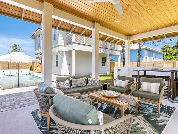 Beautiful turn key and well maintained home .5 miles from the Blue Mountain public beach park. Completely renovated in 2022 down to the studs, this home exemplifies a fresh contemporary, yet elegant lifestyle. Balancing warmth, sophistication, and comfort it's the ultimate luxury 30A retreat. Offering four bedrooms to include two primary suites, one with its own private exterior shower and a private balcony. The bunk room offers four queen beds sleeping eight comfortably. Outdoor living is one of this property's dominate features, with a large covered cabana w/ grilling, living & dining area, a large heated pool w/ waterfall, and all enclosed by privacy fencing. Great income numbers w/ heavy prime time owner usage. (2024 did $143K & 2025 has done $101k YTD, with $21K booked for 2026. ) This home was masterfully renovated by Graham Builders in 2022 with attention to detail. Offering luxury upgrades throughout to include: hardwood and custom tile floors, plantation shutters, paneled vaulted ceiling in living room, ship lap walls, custom louvered stair detail, upgraded stainless kitchen appliances with chef grade six burner gas range, custom cabinetry, Ecobee thermostats, and Sonos music system. Additional items of interest include two primary suites on each floor, secondary entry storage, large exterior storage, two exterior showers, one to shower off near the pool and another off the upstairs primary suite, private and enclosed by custom louvered wood work. This homes sits on .23 landscaped acres with a irrigation system and lawn pump. The large heated pool has a new pool heater and includes a sunbathing shelve and a lovely waterfall feature. The large custom cabana offers a large cooking and prep area with a gas grill, a dining bar, and sitting area with a newly installed TV to catch the games, or entertain the kiddos while relaxing by the pool. There is a additional covered patio off the back of the home as well, perfect for a few hammocks. Lastly this home offers a paver driveway with parking for four, plus two additional on street parking areas, a bike and golf cart parking area, and a golf cart charging receptacle.