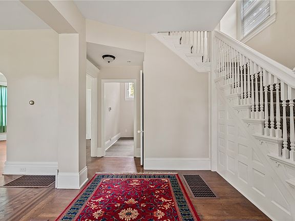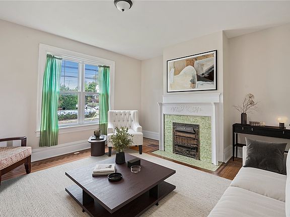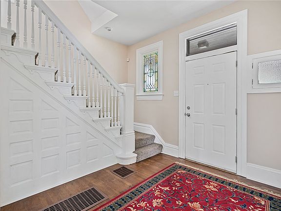 Situated on a charming cobblestone street and set on a desirable corner lot, this turn-of-the-century colonial is brimming with timeless charm. Step into the welcoming foyer where a stained glass window and original hardwood flooring with parquet edging set the tone for this exceptional home. The large dining room features a beautiful bay window, perfect for enjoying the view, while the two decorative fireplaces add to the home's classic allure. The updated kitchen offers white cabinetry, a large pantry, and a warm inviting atmosphere. Upstairs, three nice-sized bedrooms await on the second floor, PLUS you'll find an additional bedroom retreat on the third floor. This one of a kind home combines classic charm with modern comfort in a great location!