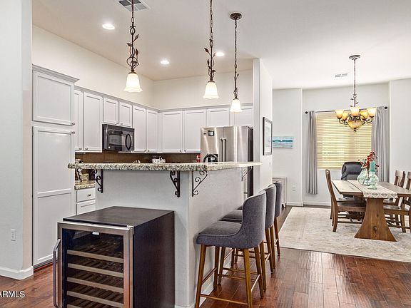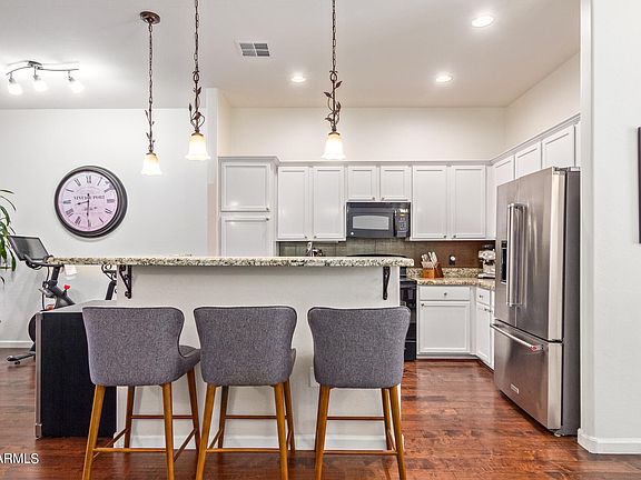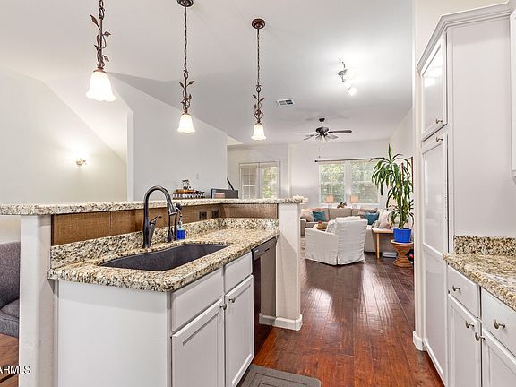 This beautiful 3 bedroom 3.5 bath townhome, built with inspirations of Spanish Colonial and Mission-style architecture, boasts the largest floor plan offered and is located on a quiet interior courtyard. It's 10' ceilings, 8' doors & oversized windows provide a bright spacious feel. Features include wood floors throughout, granite countertops with an island breakfast bar, water softening and RO systems, ceiling fans throughout, a scenic balcony and patio opening to the courtyard adding to its quaint ambiance. Also a downstairs bedroom with full bath, an attached 2 car garage with storage room and addition street parking for guests. Relax and enjoy the sparkling community pool and spa, fountains and barbeque ramada without any of the maintenance hassles. As one of the first communities in historic downtown Chandler, San Marcos Commons offers new urban living along a high-spirited avenue filled with boutiques, art galleries, one-of-a-kind local restaurants & breweries including Flix Brewhouse, Chandler Center for the Arts & San Marcos Golf Resort. Festivals of all kinds liven the streets regularly with a local farmers market, live music, wine tastings and art walks. Only a few miles from Chandler Fashion Mall and easy access to the 202, 101 & I10 freeways round out this fabulously convenient location.