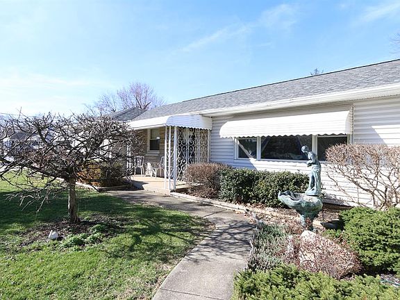 Vinyl-clad Ranch with no stair entry offers large Family Room, Dining Area and eat-in Kitchen, Half Bath in finished Basement, lots of storage inside + 2 adjoined sheds on nearly 1/2 acre lot!
