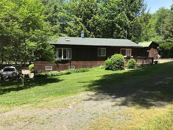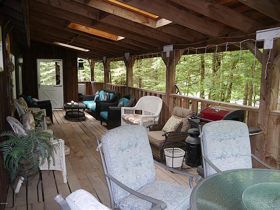 16 AC PRIVATE SETTING IN TOWN home offers 3 Bdrm 1 bath with huge covered porch overlooking year round stream with 2 car detached garage. You'll feel like you're out in the country but you're conveniently located on the outskirts of town with a babbling brook just below the covered porch. 16+ acres in a very private setting. Being sold Fully Furnished!