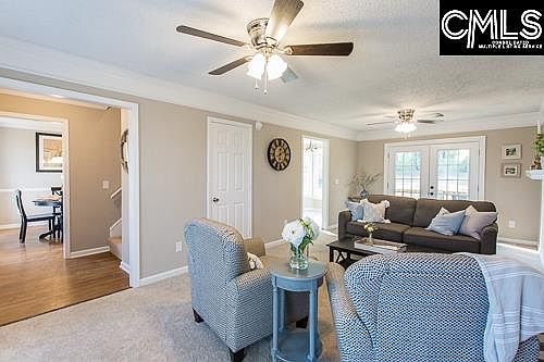 - Living Room: Fireplace, French Doors, Molding, Ceiling Fan